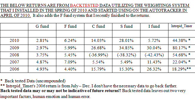 It appears this morning that US equities markets are going to open to the upside once again and is being buoyed by hopes that Europe will be able to solve their solve crisis this week and on a new austerity package being presented by Italy to helps with it's problems. I'm sure that a lot of subscribers will once again be questioning rather or not my system and it's indicators work in such a news driven market. My response to this is that yes they do work and although my return isn't up where I would like it to be, or where it should be, it has still guided me to a return of 5.54%. This is better than the C fund's 0.85%, the S fund's -3.51% and the I fund's -10.57%. I wish that I had stuck with my original system all year because my return would now be 24.41% after Friday's close and it would show just how good it is, even in these news driven markets. However, I did not as my emotions got the best of me but it was a learning experience and all I can do now is move on and use this experience to make sure it doesn't happen again.