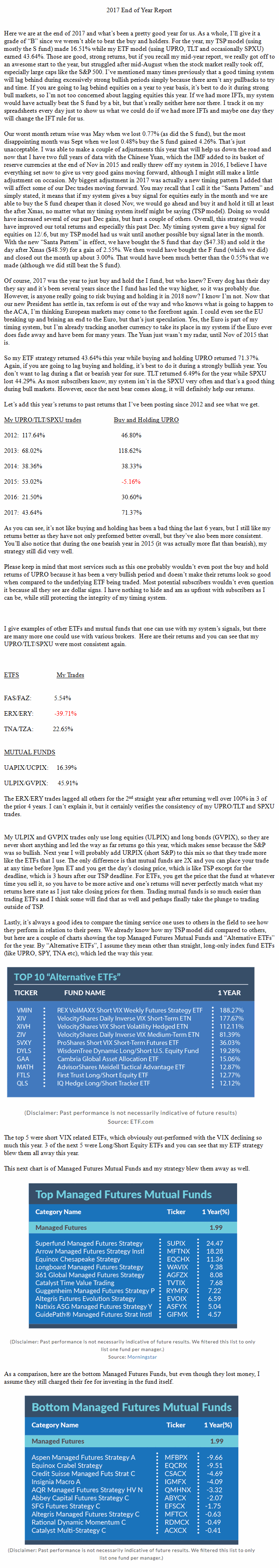 I am not a registered investment adviser and am not providing investment advice or recommendations to anyone. The information contained here is for educational purposes only. This information is being made available to show what is possible and what is not possible with the current TSP trading limits and with other investment resources outside of TSP. These TSP allocations and ETF/mutual fund buy and sell signals are purely hypothetical and past performance is not indicative of future results. I may or may not be using these securities at any given time for my own personal investments. Your investment losses and gains are your own responsibility. Please consult an investment professional before buying any investment security.